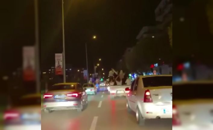 Bursa’nın Yıldırım ve Osmangazi ilçelerinde düğün konvoyu ve asker eğlencesinde sokakları adeta birbirine kattılar. Ara sokaklarda lastik yakan, motosiklet ile tek teker üzerinde seyir eden, akan trafikte araçları sollayan otomobiller, kameralara yansıdı. Bazı araçlardan ise rastgele ateş açıldığı görüldü. Motosiklet ile lastik yakan 2 genç, motosikletin ani hızlanması sonucunda yere düştü bu anlar cep telefonu kameralarına yansırken, sosyal medyada kısa sürede yayılan görüntüler büyük tepki çekti.