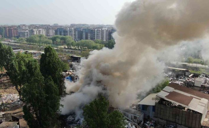 Bursa’da meslek lisesi yakınlarındaki geri dönüşüm tesisinde meydana gelen yangın korkuya neden oldu. Yangın dronla havadan görüntülendi.