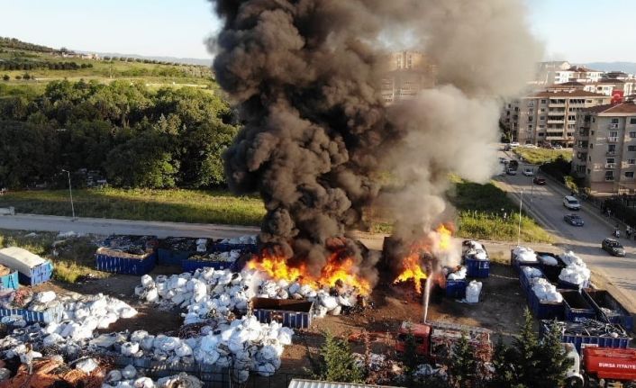 Bursa’nın merkez Osmangazi ilçesinde bulunan bir geri dönüşüm tesisinde çıkan yangın, itfaiye ekiplerinin yaklaşık 1 saatlik müdahalesiyle kontrol altına alındı. Dumanların gökyüzünü kapladığı yangın drone ile görüntülendi.