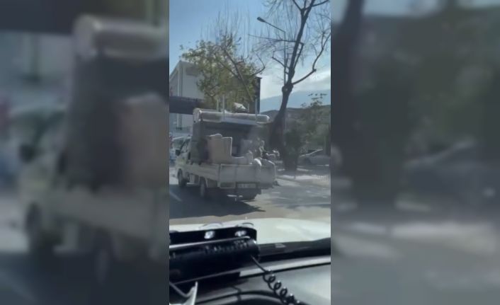 Bursa’da eşya taşıyan bir kamyonetin arkasında koltuğa oturan vatandaş, hayatını tehlikeye attı. Bu anlar bir vatandaşın cep telefon kamerasına yansıdı.