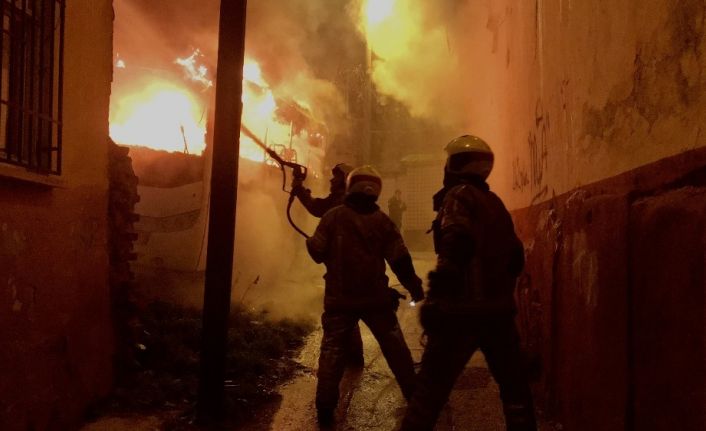 Bursa’da bina önünde park halinde bulunan iki otobüs, alevler içinde kaldı. Alevler geceyi aydınlatırken, yan binada oturan yaşlı çift dumandan etkilendi. Yangın çevre binalara sıçramasına karşı tedbir amaçlı bina tahliye edildi. İtfaiye ekiplerinin söndürdüğü araçlar, kullanılamaz hale geldi.