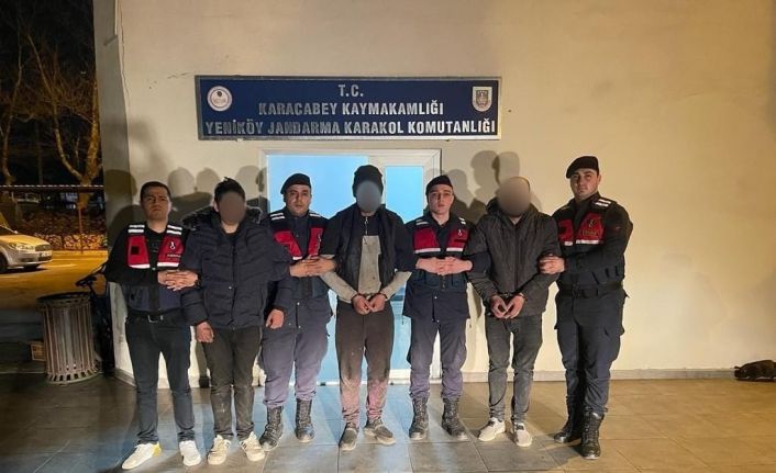 Karacabey İlçesi Bayramdere Mahallesi’nde, eski polis kampı binası içerisinde hırsızlık yaparken jandarma devriyesini görerek kaçan S.A.G. (26), B.A. (29), G.İ. (16) isimli zanlılar yapılan takip sonucu kıskıvrak yakalandı. Üst aramasında B.A isimli şahıstan kuru sıkı tabanca, 15 adet fişek, şarjör ve uyuşturucu içiminde kullanılan payp ele geçirildi. Çevrede yapılan kontrolde şüpheliler tarafından olayda kullanılan, çok sayıda tornavida, anahtar gibi küçük el aletleri ve 100 kilogram bakır kablo ele geçirildi.