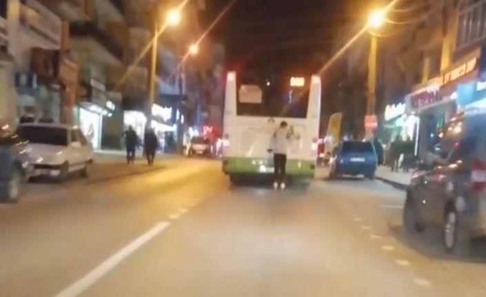 Bursa’nın merkez Osmangazi ilçesi Dikkaldırım Mahallesi’nde sefer yapan özel halk otobüsünün arkasına tutunarak patenleriyle kayan genç adeta ölüme davetiye çıkardı. Diğer araç sürücüsü ve vatandaşların tepkisini dikkate almayan gencin tehlikeli yolculuğu cep telefonu kamerasına anbean yansıdı.
