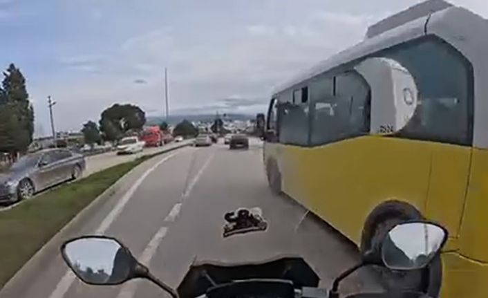 Bursa’da seyir halindeki motosiklet sürücüsü, aniden şeridine giren otobüs nedeniyle tehlike atlattı. Yaşanan gerginlik kask kamerasına saniye saniye yansıdı.