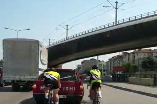 Bursa-Ankara yolu üzerinde üç bisiklet sürücüsü, bir kamyonetin arkasına tutunarak seyahat etti. Kendilerinin ve diğer sürücülerin can güvenliğini tehlikeye atan üç kişiyi görüntüleyen başka bir araçtaki yolcu, bisikletlilerin kilometrelerce bu şekilde seyahat ettiğini dile getirdi.