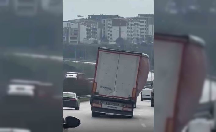 Bursa’da seyir halindeki bir tırın yolda yan şekilde ilerlemesi trafikte tehlikeli anlara neden oldu. Zaman zaman devrilme tehlikesi geçiren tır, çevredeki sürücülere korku dolu anlar yaşattı.