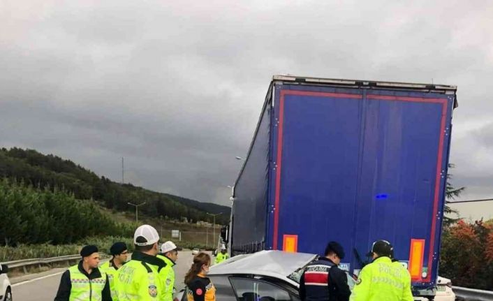 Edinilen bilgiye göre, İnegöl istikametinden Bursa istikametine seyreden V.Y. idaresindeki 77 EES 876 plakalı otomobil yoğun yağış sonucu görüş mesafenin düştüğü ve kayganlaşan yolda viraja girdiği sırada kontrolden çıkarak önce bariyerlere daha sonra aynı istikamette giden K.S. idaresindeki 10 AEE 069 plakalı tıra yandan çarptı.