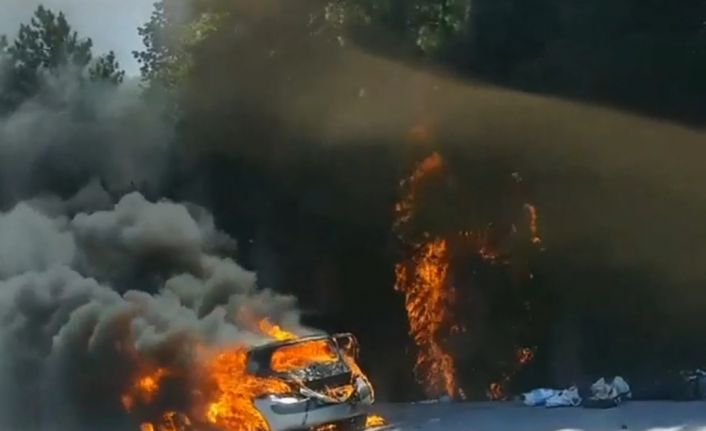Bursa’da yol kenarında yanan otomobildeki alevler ormana sıçradı. O anlar kameralara yansıdı.