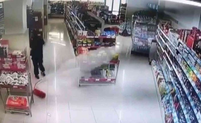 müşteriler panikle kendini dışarı attı. Yaşananlar ise marketin güvenlik kameraları tarafından saniye saniye kaydedildi.