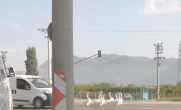 Bursa’da bir grup kaz şehirlerarası yola çıktı. Araçlar son anda dururken; kazlar nedeniyle trafikte aksama yaşandı.