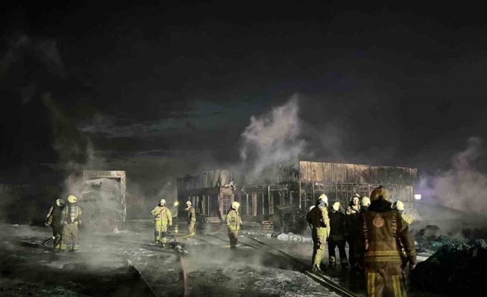 Edinilen bilgiye göre, Büyükçekmece Çakmaklı Mahallesi’nde bir şirketin deposuna ait açık alanda yer alan palet ve plastik kasalar henüz bilinmeyen bir nedenle yanmaya başladı. Kısa sürede büyüyen alevler park halindeki 2 kamyon ve 1 tıra da sıçradı. İhbar üzerine olay yerine çok sayıda itfaiye, polis ve sağlık ekibi sevk edildi. Polis ekipleri çevrede güvenlik önlemi alırken, itfaiye ekipleri yangını söndürmek için çalışma başlattı. 2 saat süren çalışmalar sonucu yangın söndürüldü. Yangın anı ve ekiplerin söndürme çalışmaları ise dronla görüntülendi.