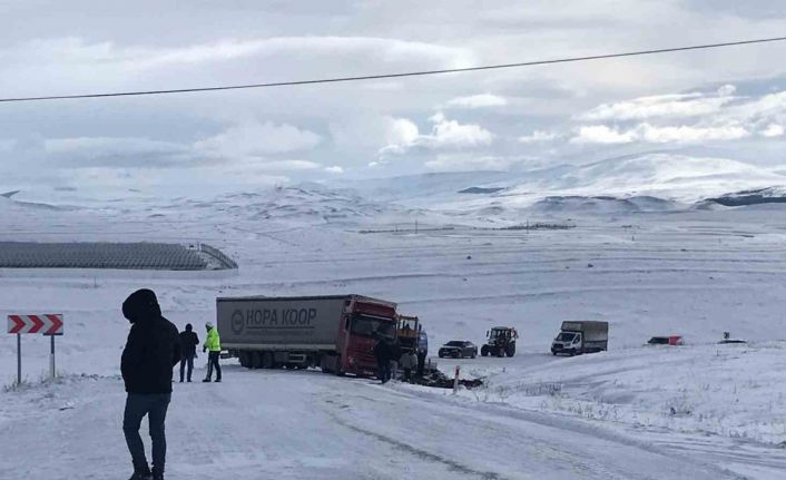 Kaza, sabah saatlerinde Hanak- Damal karayolunun 3. kilometresinde meydana geldi. Sürücüsü ve plakalı öğrenilemeyen tır, kar ve buzlanma nedeniyle kayganlaşan yolda kayarak yolu trafiğe kapattı.