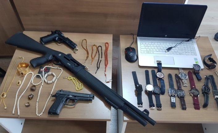Hırsızlık Büro Amirliği Ekipleri’nin yaptığı aramalarda ele geçirilen 1 adet notebook, 13 adet değişik markalarda saat, 12 adet gümüş yüzük, 5 adet tespih, çeşitli takı malzemeleri, altın renginde imitasyon takı seti, 1 adet ruhsatsız tüfek, 2 adet kurusıkı tabanca ele geçirildi.