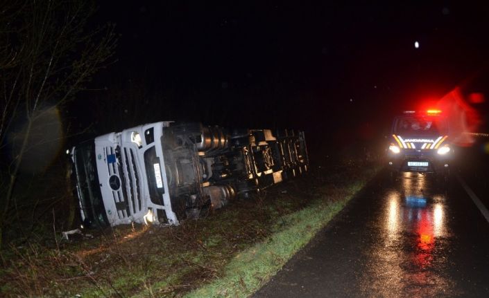 Tekirdağ’ın Malkara ilçesinde sağanak yağışta sürücüsünün direksiyon hakimiyetini kaybettiği tır, şarampole devrildi. Yaralanan tır şoförü hastaneye kaldırıldı.