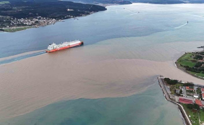 Çanakkale Boğazı’nda denizin bir bölümü, sağanak yağış sonrası farklı bölgelerden boğaza akan çamurlu su nedeniyle kahverengiye döndü. Boğazın renginin değiştiği dron ile görüntülendi.