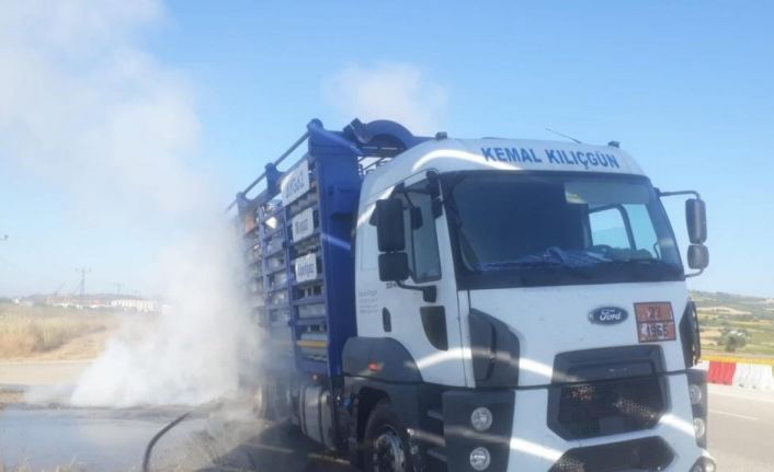 Çanakkale’nin Gelibolu ilçesinde tüp taşıyan bir kamyonun önce lastiği patladı daha sonra fren balataları alev aldı.