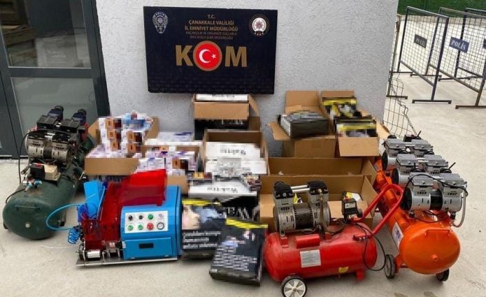 Çanakkale İl Emniyet Müdürlüğü Kaçakçılık ve Organize Suçlarla Mücadele (KOM) Şube Müdürlüğüne bağlı Kaçakçılık Suçları Büro Amirliği ekipleri, kaçakçılıkla mücadele çerçevesinde 5607 SKM suçundan, R.Ö, M.K, A.B ve Z.K isimli şahısların depo ve aracında yapılan adli aramalarda 1 adet sigara sarma makinesi, 3 adet hava kompresörü, 35 bin adet doldurulmuş sigara, 59 bin 400 adet boş makaron, 21 kilogram ( 21 paket ) bandrollü tütün, 41 adet mükerrer kullanılmak üzere kesilmiş bandrol ele geçirildi.