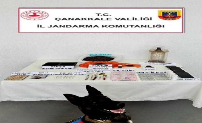 Çanakkale’de jandarma ekiplerinin düzenlediği uyuşturucu operasyonunda yakalanan 9 şüpheliden 3’ü tutuklanırken 450 gram sentetik kannabinoid, 120 adet sentetik ecza, 6 adet satışa hazır fişeklenmiş sentetik kannabinoid, 6 adet uyuşturucu kullanma aparatı payp, uyuşturucu kullanma aparatı kova, öğütme aparatı, 9 adet cep telefonu ve 6 bin 200 TL ele geçirildi.