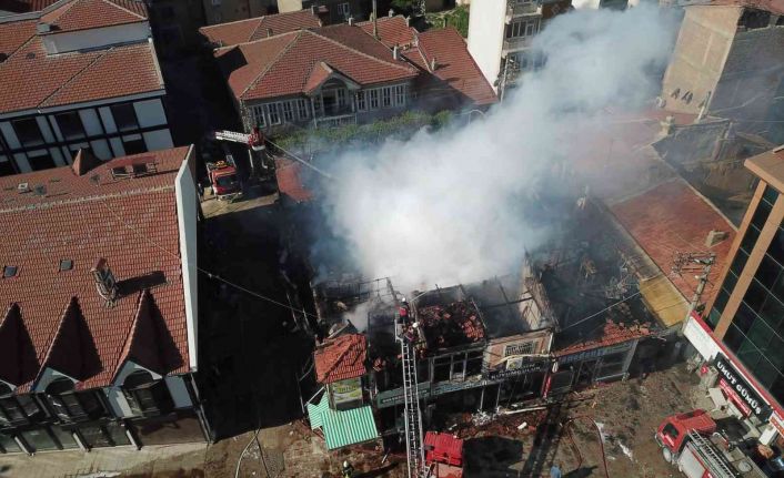 Afyonkarahisar’ın Bolvadin ilçe merkezinde çıkan ve 15 iş yerinin yandığı, 5’inin de kısmi zarar gördüğü çarşı yangında dron ile havadan çekilen görüntü yaşanan faciayı gözler önüne sererken, çevre esnafının iş yerlerinden eşyalarını kurtarmasına polis ile bekçiler yardım etti.