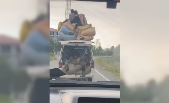 İlçeye bağlı Kavak köyü yolu üzerinde seyir halinde ilerleyen hafif ticari aracın tehlikeli yolcuğu yürekleri ağza getirdi. Aracın iç ve üstü bölümü çay bohçalarıyla dolarken, bagaj kapağı açık bir şekilde ilerliyor. Bu yetmezmiş gibi aracın üst bölümünde bulunan çay bohçalarını üzerinde oturan iki kişinin yolcuğu ise görenlerin yüreklerini ağza getirdi.