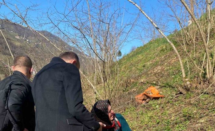 Trabzon’un Vakfıkebir ilçesinde cenazeye katılmak üzere yola çıkan vatandaşların dikkati, fındık bahçesine yuvarlanan yaşlı kadının hayatını kurtardı.