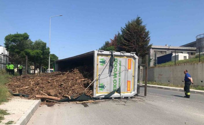 Çerkezköy Organize Sanayi Bölgesi’nde kavşakta hızını alamayan odun talaşı yüklü tırın devrilmesi sonucu 1 kişi yaralandı.