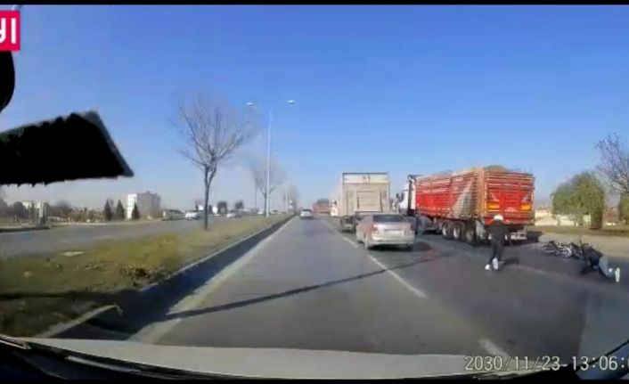 Eskişehir’de, seyir halinde iken iki kamyonun arasında kontrolünü kaybederek kaza yapan motosikletdeki gençlerin kurtulma anı araç kamerasına yansıdı.