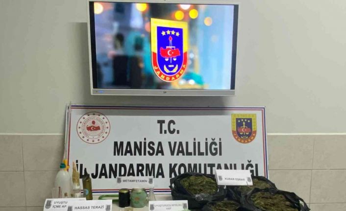 Manisa’nın Akhisar ilçesinde Jandarma ekipleri tarafından alınan duyum üzerine cezaevinde tutuklu bulunan şüpheli R.T.’nin adresinde dün saat 16.00’da yapılan aramada, evin bahçesinde toprağa gömülü silah ve tabanca kümes ve evin farklı yerlerine saklanmış esrar ve uyuşturucu haplar bulundu. Aramada, 3.100 gram kubar esrar, 300 gram metamfetamin, 14 adet bong, 401 adet panama ibareli uyuşturucu hap (extasy), 2 adet hassas terazi, 1 adet 9 mm çapında ruhsatsız tabanca, tabancaya ait şarjör, şarjöre takılı 2 adet mermi, 1 adet ruhsatsız av tüfeği ve 1 adet oluk bıçak bulunarak el konuldu.