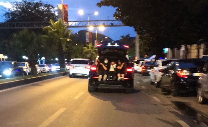 Zonguldak’ın Ereğli ilçesinde seyir halindeki cipin bagajında oturan 3 çocuğun tehlikeli yolculuğu cep telefonu kamerasına yansıdı.