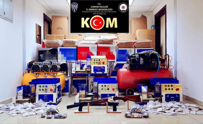 Edinilen bilgiye göre, Çorum Emniyet Müdürlüğüne bağlı Kaçakçılık ve Organize Suçlarla Mücadele Şube Müdürlüğüne bağlı ekipler, İl merkezinde iki şahsın kaçak makaron sigara üreterek sattığı bilgisine ulaştılar. Düzenlenen operasyonda şüpheli şahısların işyeri, depo ve araçlarında yapılan adli aramada çeşitli markalarda 508 bin 700 adet kaçak makaron sigara, 441 kilogram kaçak sarma sigaralık kıyılmış tütün, 4 adet çeşitli marka ve ebatlarda otomatik sigara sarma makinesi, Bin 500 adet kullanılmış ve tekrar kullanıma hazır TAPDK bandrolü, 2 adet çeşitli marka ve ebatlarda sigara basımında kullanılan hava kompresörü, 1 adet üzerinde marka ve ibare bulunmayan ruhsatsız tüfek ile 2 adet üzerinde marka ve ibare bulunmayan kurusıkı tabanca ele geçirildiler.
