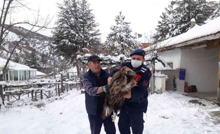 Öte yandan, jandarma ekipleri tarafından donmak üzereyken bulunan akbaba, bir süre sıcak bir ortamda bekletildikten sonra yiyecek ve su verildi.