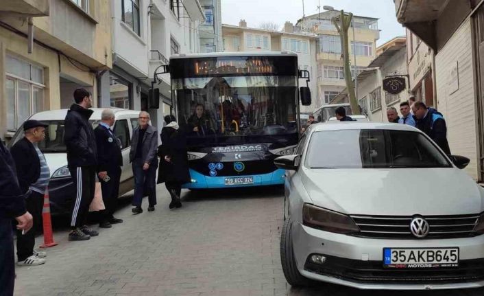 Tekirdağ’ın Süleymanpaşa ilçesinde dar sokakta hatalı park eden otomobil, belediye otobüslerini sıraya dizdi. Sokakta trafik kuyruğu yaşanırken otobüslerde bekleyen vatandaşlar duruma tepki gösterdi.