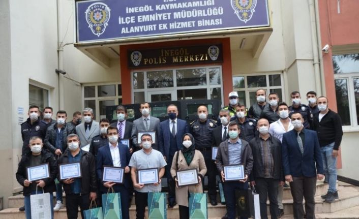 Kaymakamlık tarafından verilen başarı belgeleri İnegöl İlçe Emniyet Müdürü Erdoğan Baydemir tarafından 23 personele düzenlenen törenle Polis Merkezinde takdim edildi.