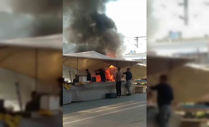 Adana’da depremzede aile tarafından semt pazarına kurulan çadır yanarken, olayda maddi hasar meydana geldi.