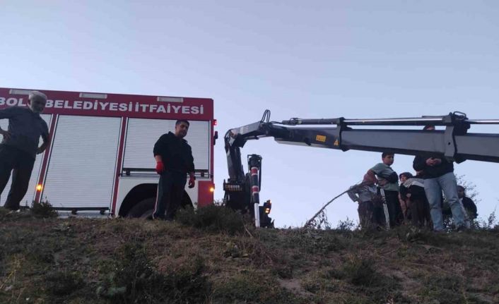 Bolu’nun Büyüksu Deresi’nde mahsur kalan inek, itfaiye ekiplerince vinç yardımıyla kurtarıldı.