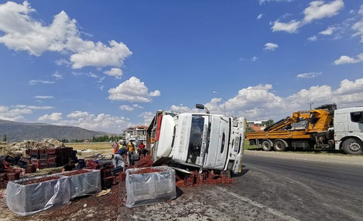Afyonkarahisar Dinar ilçesinde kontrolden çıkan vişne yüklü kamyon devrildi. Ölen ya da yaralananın olmadığı kazada tonlarca vişne yola saçılarak ziyan olurken, kaza bölgesine gelen işçiler ise küreklerle vişneleri kasalara doldurmaları dikkatlerden kaçmadı.