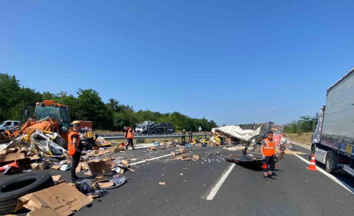 Kırklareli’nin Lüleburgaz ilçesi İstanbul-Edirne TEM Otoyolu’nda, Karayollarına ait araca çarpan lastik yüklü tırın devrilmesi sonucu otoban tek yönlü olarak kapandı.