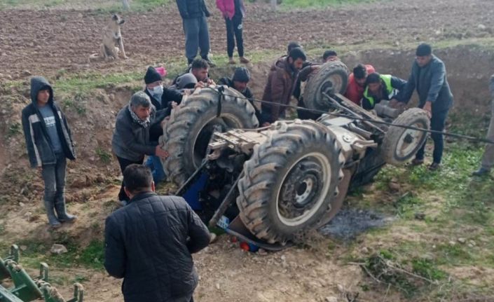 Şanlıurfa’nın Birecik ilçesinde fıstık bahçesini süren sürücü, devrilen traktörün altında kalmaktan son anda kurtuldu.