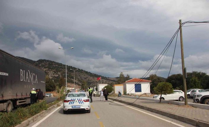 Edinilen bilgiye göre, Gazderesi Caddesi’nden Bodrum - Turgutreis karayoluna ilerleyen Kadir Yüzlek idaresindeki 26 TK 774 plakalı tırın dorsesi, rüzgarla aşağı sarktığı iddia edilen telefon kablolarına takıldı. Kabloların gerilmesiyle birlikte caddenin her iki yanındaki 2 telefon direği kırılarak devrildi. Kırılan direklerden biri bölgede park halindeki 2 otomobile çarptı, otomobillerden birinin lastiği patladı. Kabloların takıldığı trafik levhası yıkıldı, çöp konteynırı metrelerce sürüklendi. Tır sürücüsü, otomobil lastiğinin patlama sesini duyunca durdu. Hasar alan park halindeki 2 otomobilden 1’inde bulunan sürücü ve yolcular kazayı yara almadan atlattı.