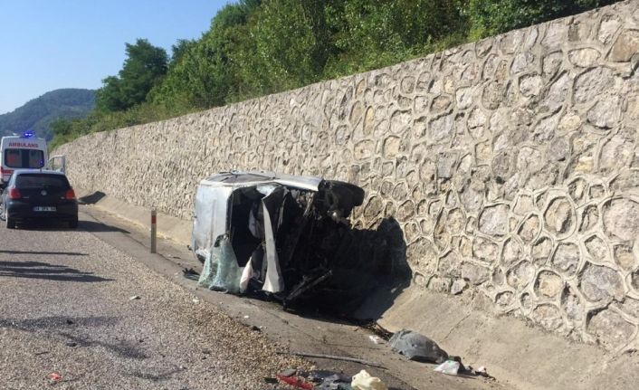 Bartın’da meydana gelen kazada direksiyon hakimiyetini kaybeden araç sürücüsü taş duvara çarparak yan yattı.