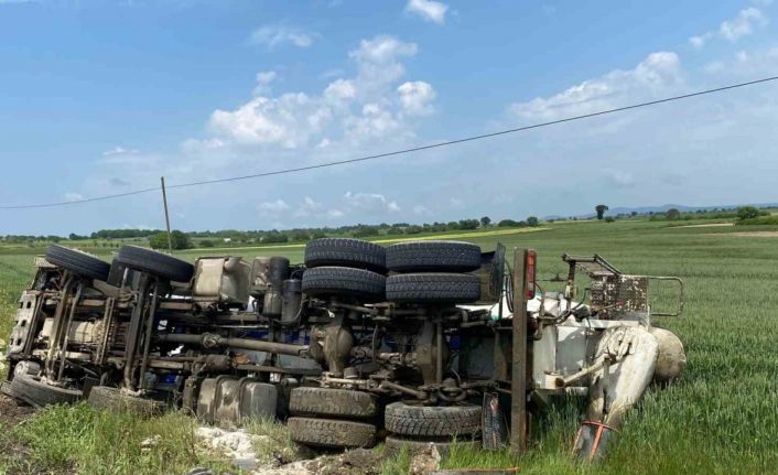 Tekirdağ’da meydana gelen trafik kazasından direksiyonu kilitlenen beton mikseri devrilerek yan yattı.