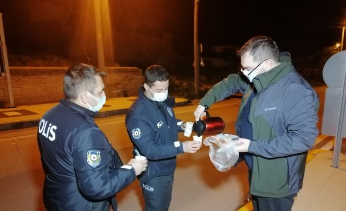 Aksaray’da görev yapan doktor evinin önündeki kavşakta uygulama yapan polis memurlarına çay ve kek ikramında bulundu.