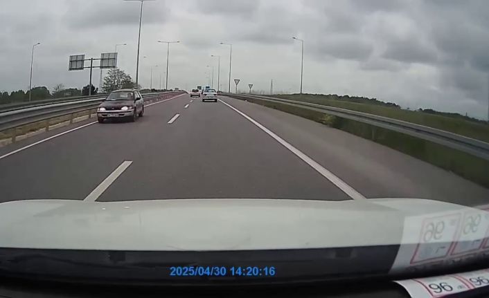 Sakarya’nın Akyazı ilçesinde ters yönde giden otomobil tehlike saçtı. Araç sürücüsünün hem kendi hem de diğer sürücülerin canını ve hiçe sayarak, uyarılara aldırmadan yoluna devam ettiği anlar saniye saniye kaydedildi.