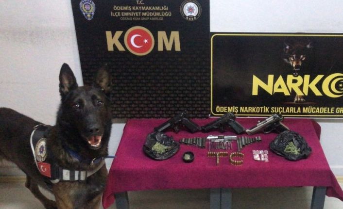 Ödemiş Kaçakçılık ve Organize Suçlarla Mücadele Büro Amirliği ve Ödemiş Narkotik Büro Amirliği ekipleri, bir kişinin dükkanında kuru sıkı tabancaların namlusunu açtığı ve satışını yaptığı ihbarı üzerine harekete geçti. Adrese düzenlenen operasyonda polis köpeği Ateş, A.A. isimli şahsın sakladığı zulaları bulmakta zorlanmadı. Adreste yapılan aramada 3 adet farklı markalarda kuru sıkıdan çevrilmiş tabanca, silah çevirme işleminde kullanılan aparatlar, 1 adet sürgü, 33 adet fişek, 3 adet ravya, 53 gram esrar maddesi ve sentetik ecza malzemeleri ele geçirildi. Gözaltına alınan A.A.’nın yapılan incelemede uyuşturucu madde ticaretinden 2 yıl 7 ay hapis cezası nedeniyle aranması olduğu anlaşıldı. Şahıs, emniyetteki işlemlerinin ardından adliyeye sevk edildi.