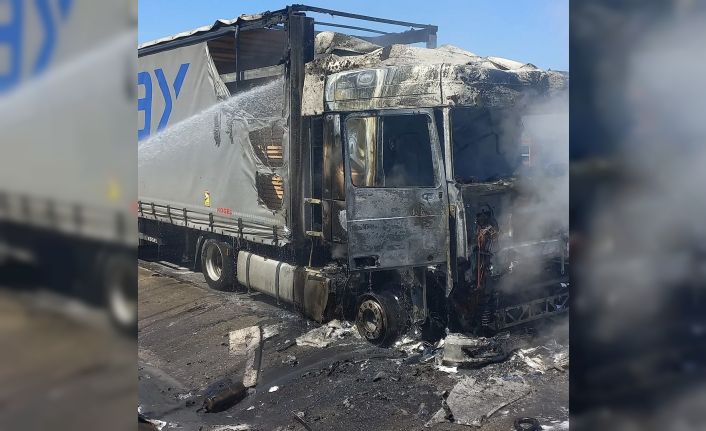 Edirne’de seyir halindeki kereste yüklü tır, çıkan yangında kullanılamaz hale geldi.