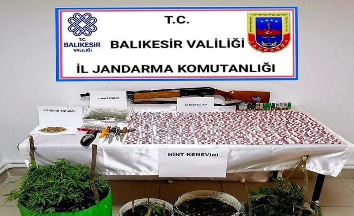 Edinilen bilgiye göre, Balıkesir’in Edremit ilçesinde jandarma ekipleri, uyuşturucu madde imal ve ticareti yaptığı tespit edilen 9 şüpheliye ait adreslere operasyon düzenledi. Şüphelilerin ev ve diğer adreslerinde yapılan aramalarda bin 318 sentetik uyuşturucu hap, 141 gram kubar esrar, 1 gram toz esrar, 36 kök dişi Hint keneviri, 1 av tüfeği, 19 fişek, 5 kesici delici alet ve 7 cep telefonu ele geçirildi. Jandarma, 9 şüpheliyi gözaltına aldı.Edremit’te uyuşturucu operasyonu: 9 gözaltı