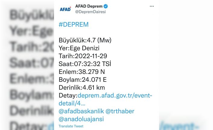 Afet ve Acil Durum Yönetimi Başkanlığı (AFAD) verilerine göre, Ege Denizi’nde saat 04.32’de 4.7 büyüklüğünde deprem meydana geldi. Çeşme’ye 191 kilometre mesafede gerçekleşen depremin derinliği 4.61 kilometre olarak ölçüldü. İlçede kısmen hissedilen depremde, ilk belirlemelere göre herhangi bir hasarın meydana gelmediği öğrenildi.