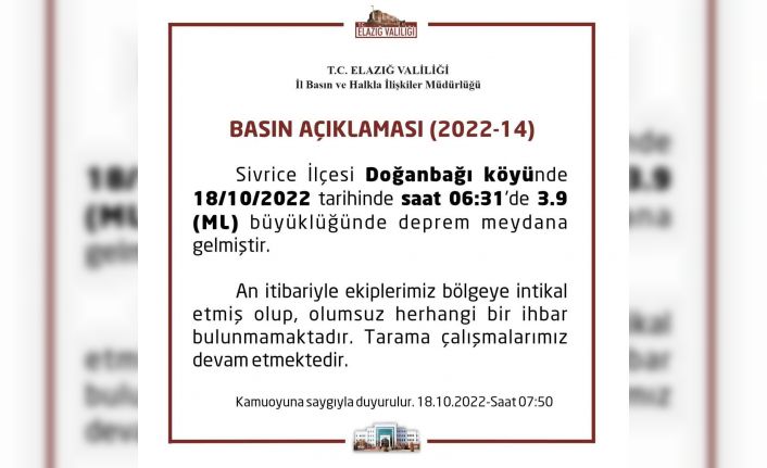 Elazığ Valiliği tarafından yapılan açıklamada, “Sivrice ilçesi Doğanbağı köyünde 18/10/2022 tarihinde saat 06:31’de 3.9 (ML) büyüklüğünde deprem meydana gelmiştir. An itibariyle ekiplerimiz bölgeye intikal etmiş olup, olumsuz herhangi bir ihbar bulunmamaktadır. Tarama çalışmalarımız devam etmektedir" denildi.