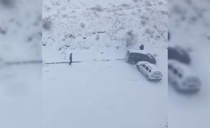 Bir çok ilde olduğu gibi Elazığ’da da kar yağışı etkili oldu, şehir beyaza büründü. Kent merkezinde ekipler, karla mücadele çalışması yaparken, karlı yollar araçlarıyla yola çıkanlara da zor anlar yaşattı. Çaydaçıra Mahallesi’nde bir otomobil, karla kaplanan bir rampayı çıkmaya çalıştı ama ilerleyemeyerek geri geri aşağı doğru sürüklendi. Aracın geldiğini gören bir kişi ise kenara çekilirken, otomobil bir araca çarptı. O anlar ise bir kişinin cep telefonu kamerasına yansıdı.Elazığ’da karlı yolda otomobil böyle kaydı