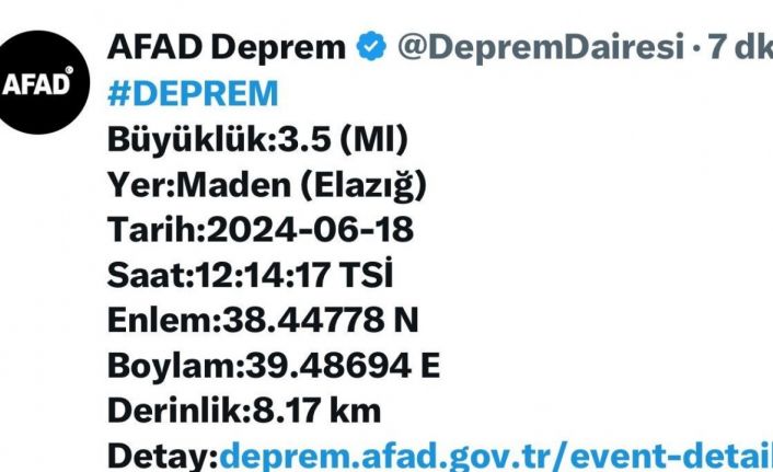Elazığ’ın Maden ilçesinde 3.5 büyüklüğünde deprem meydana geldi.